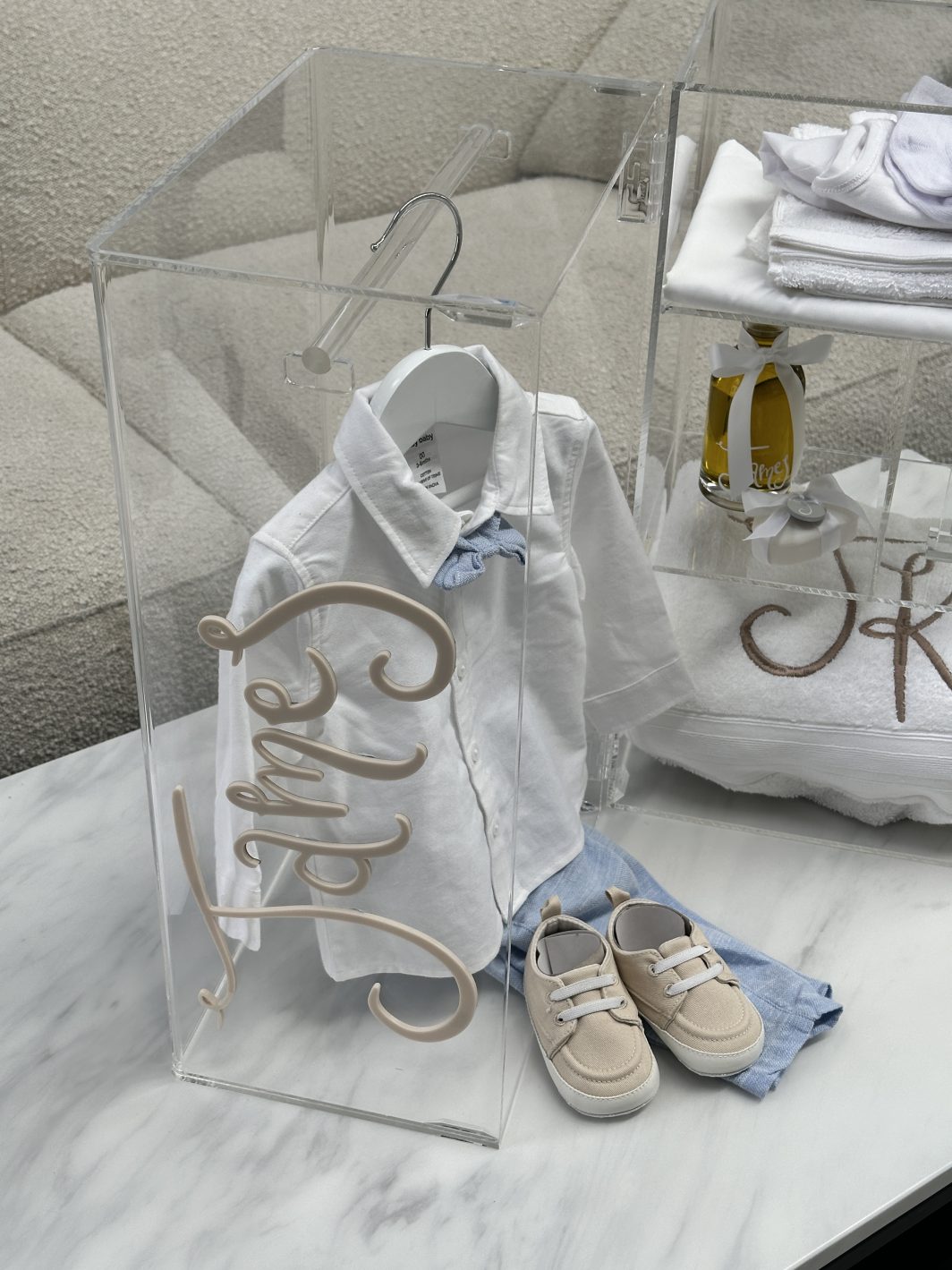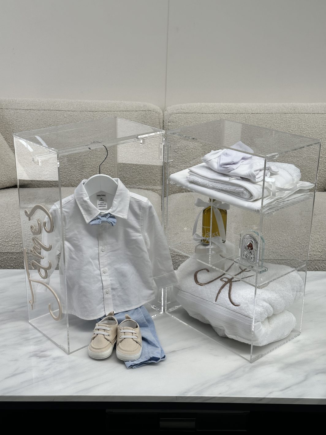 We’re excited to bring a unique and ultra modern clear acrylic cupboard style keepsake christening box to our Luxx Christening range!