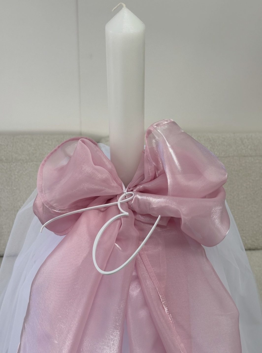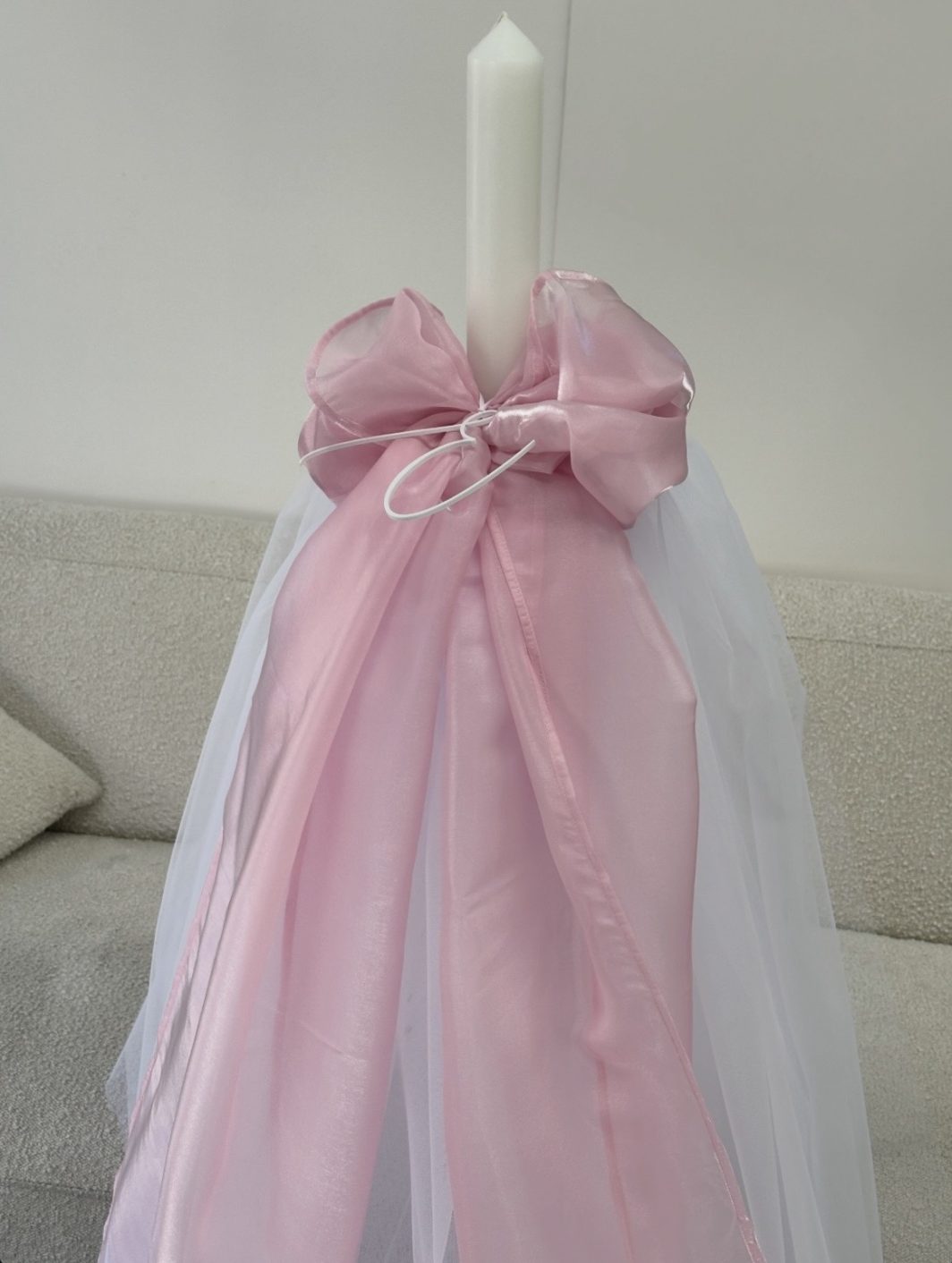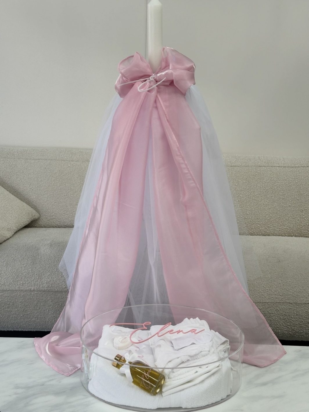 - Candle design includes; soft white tulle skirt with pink organza bow and white acrylic initial option to choose pink to match the box