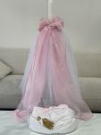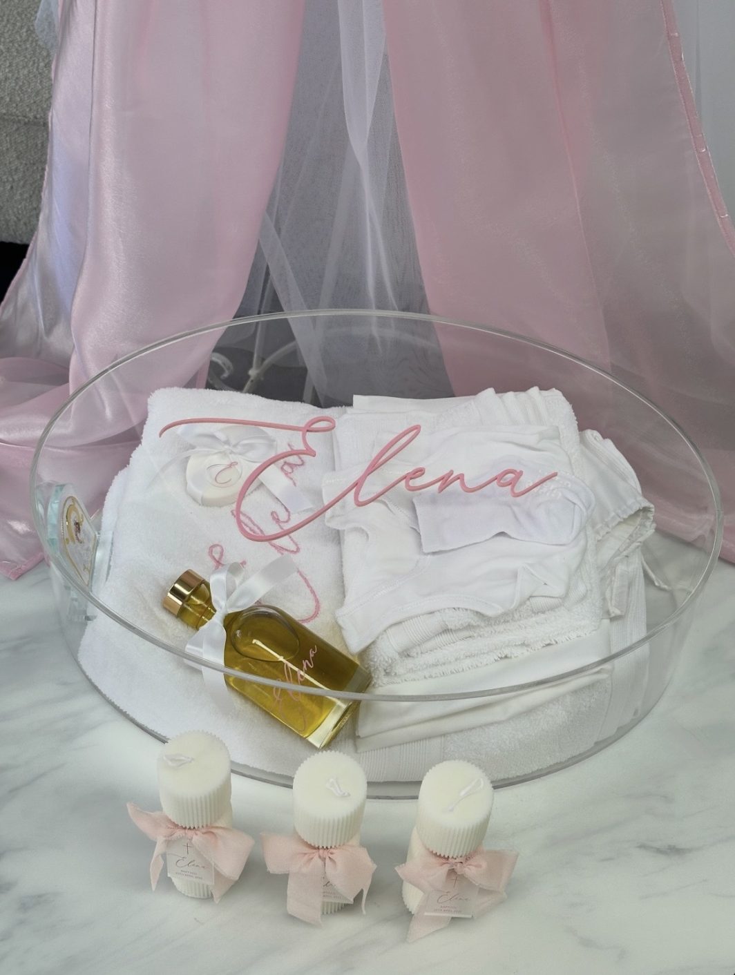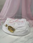 A new set added to our collection. Elena is the complete set; with a clear acrylic oval box with pink acrylic name, complete with Deluxx contents with added embroidery on the bath sheet, lambatha design is a white tulle skirt with a pink organza bow and white initial to match.