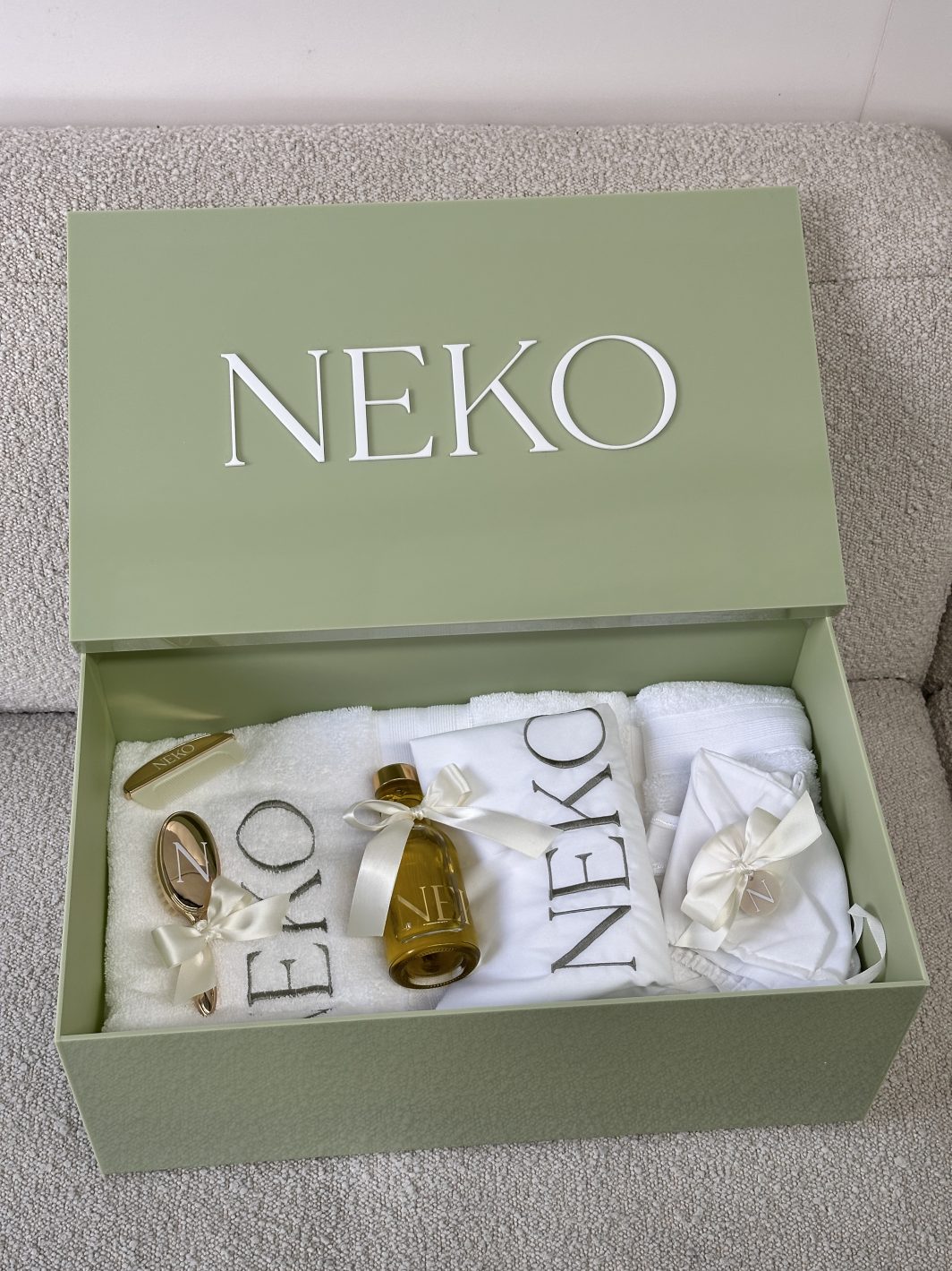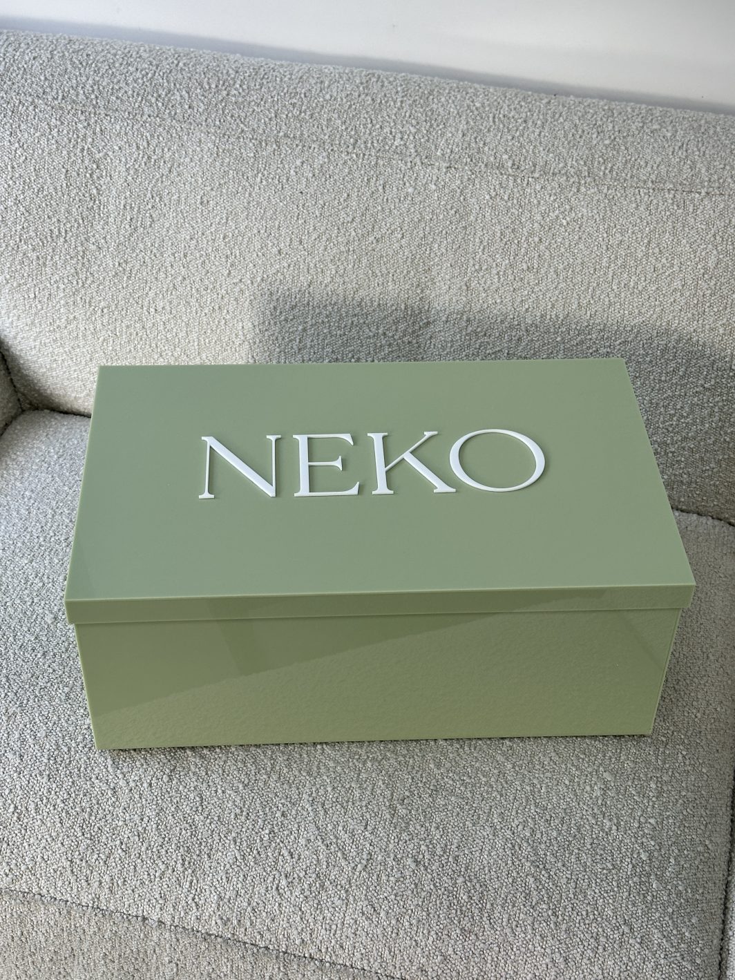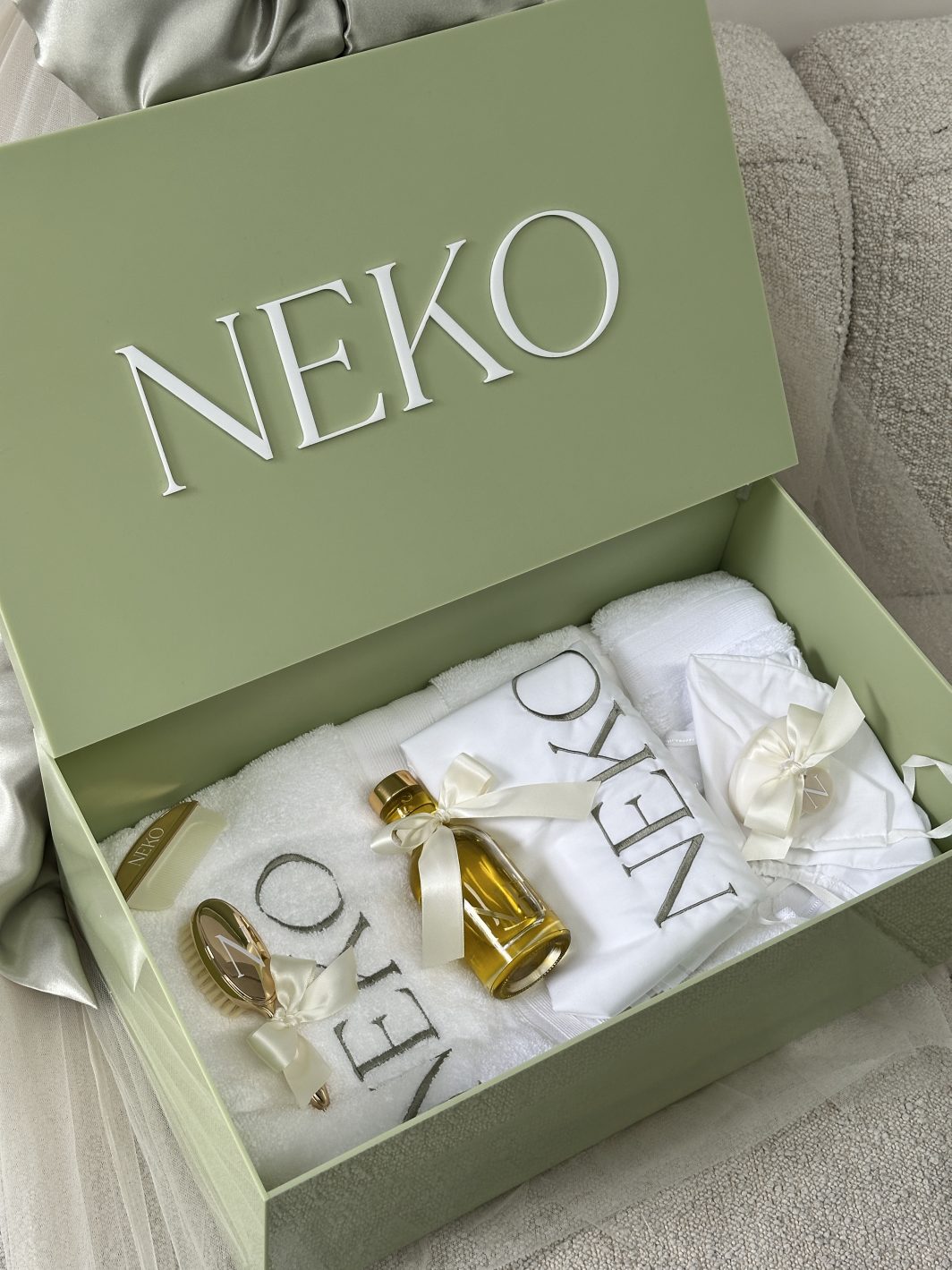 A new set added to our collection. Neko features a custom made sage acrylic box with white acrylic name complete with a custom made sage organza bow with soft nude beige tulle skirt. This beautiful set is gender neutral.