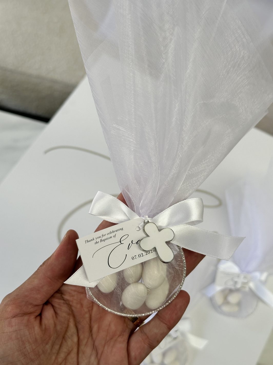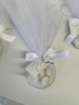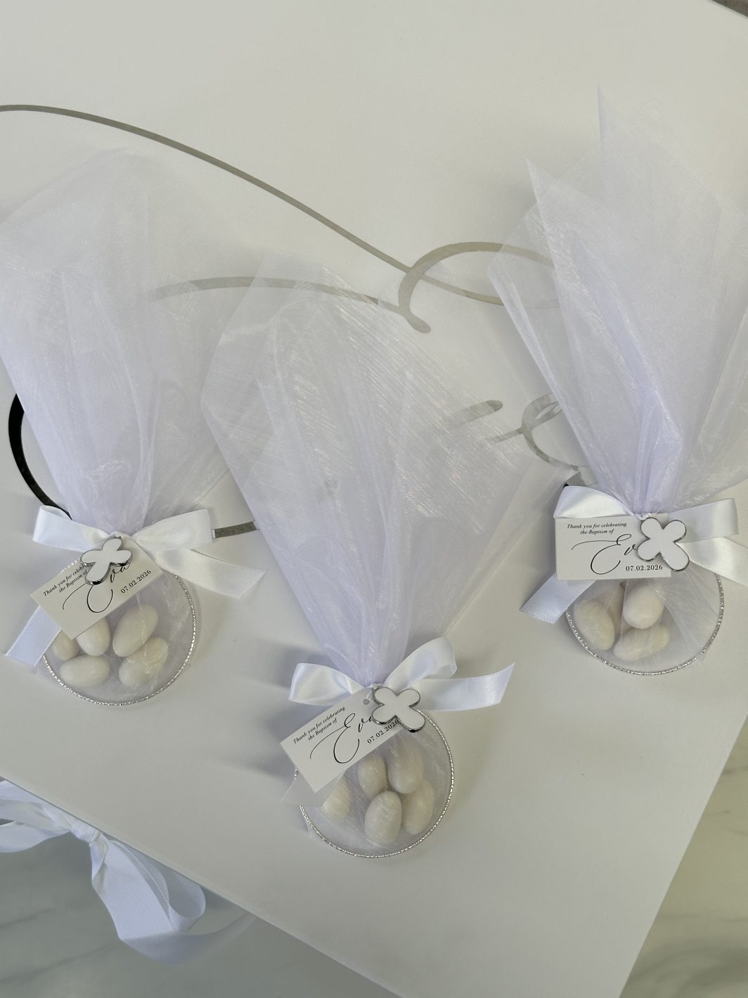 We’re excited to add a new style to our bonbonniere range. Metallic rings wrapped in soft white organza, filled with 5 sugar almonds & personalised with a choice of an acrylic mirror tag or paper tag. These are a perfect cost effective option for your wedding, engagement, or christening.