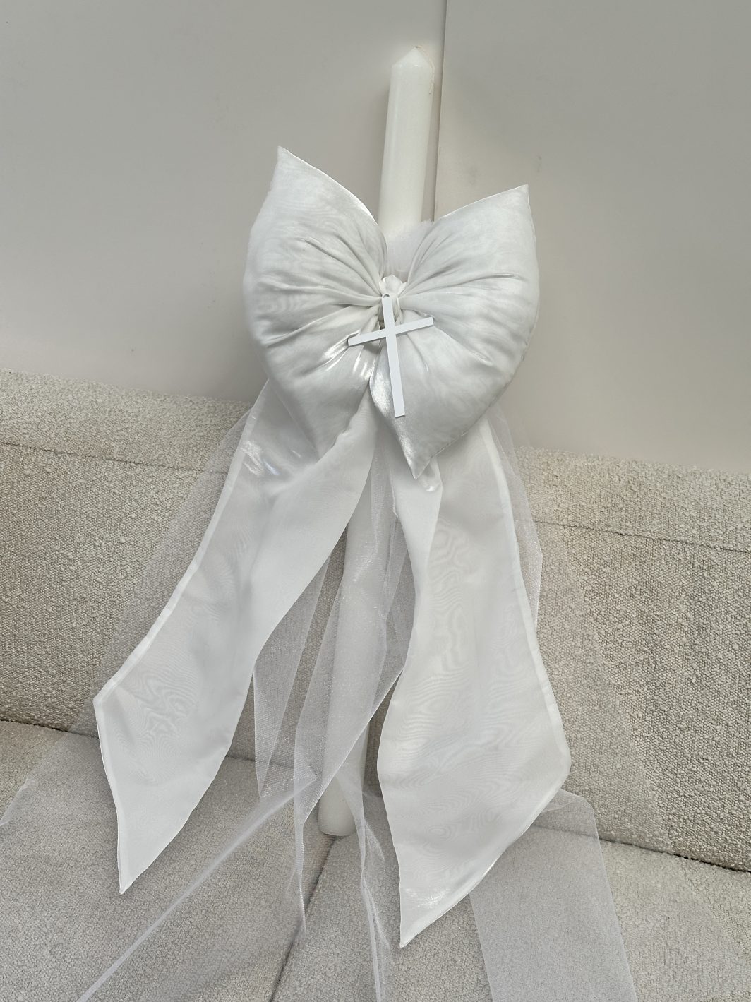 WHITE ORGANZA FABRIC BOW & TULLE CHRISTENING LAMBATHA CANDLE